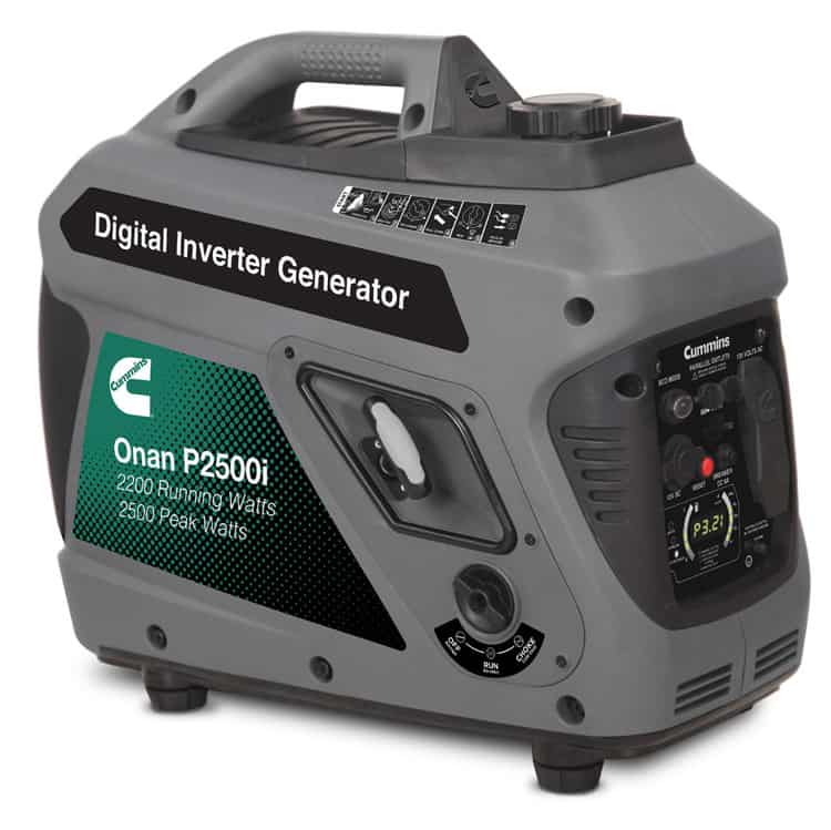 The Cummins-Onan P2500i Digital Inverter Portable Generator features ultra-quiet 52 dBA noise that compares to quiet conversation. Easy to carry wherever its needed with the built-in carry handle—weighs just 48 pounds. Parallel ready with optional kit. Great for camping, smaller RV travel trailers, and truck campers.